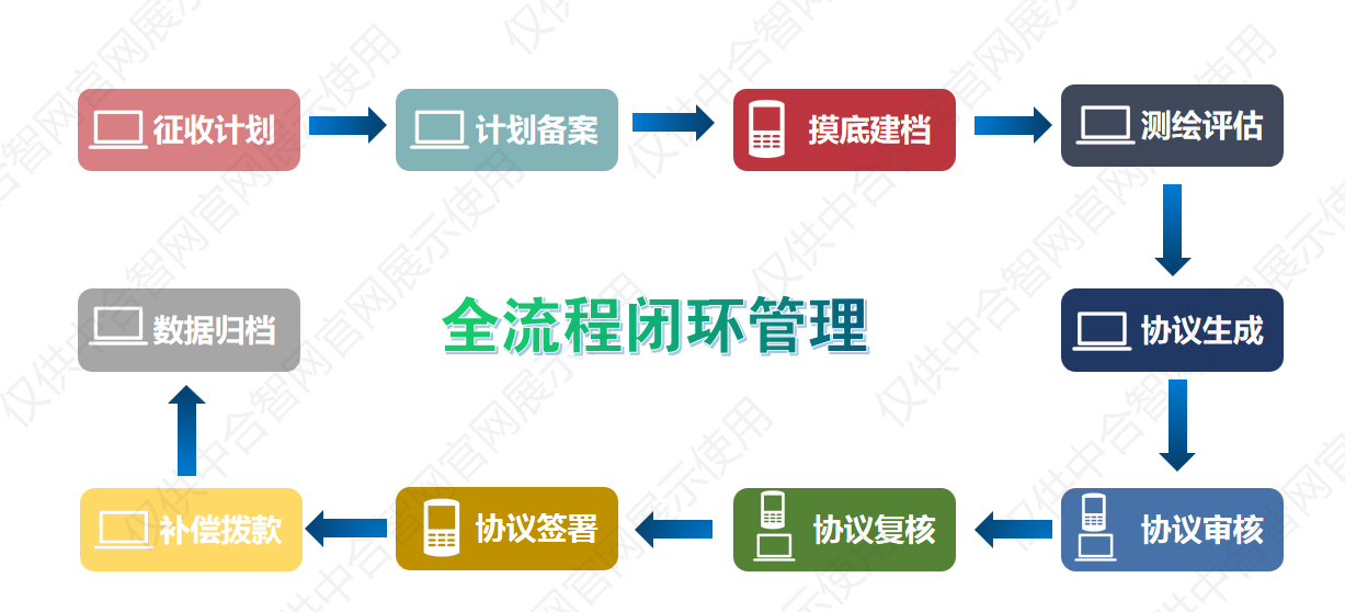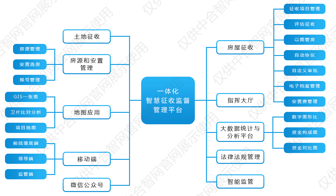 系统由前线摸底APP、监管端、领导端APP、微信服务端组成。包含系统管理、权限配置、征收业务管理、征收档案管理、数据分析预警、GIS地图应用、风险点监控管理在内的全部功能模块,实现从征收计划、申请到项目完成全流程通过系统进行流程审核和管控,系统生成单据、报表。避免原有手工统计进度的数据滞后性和随意性问题,提高了查询时效性,对征收项目的档案实现电子信息化管理,最终形成完备的征收档案数据库。